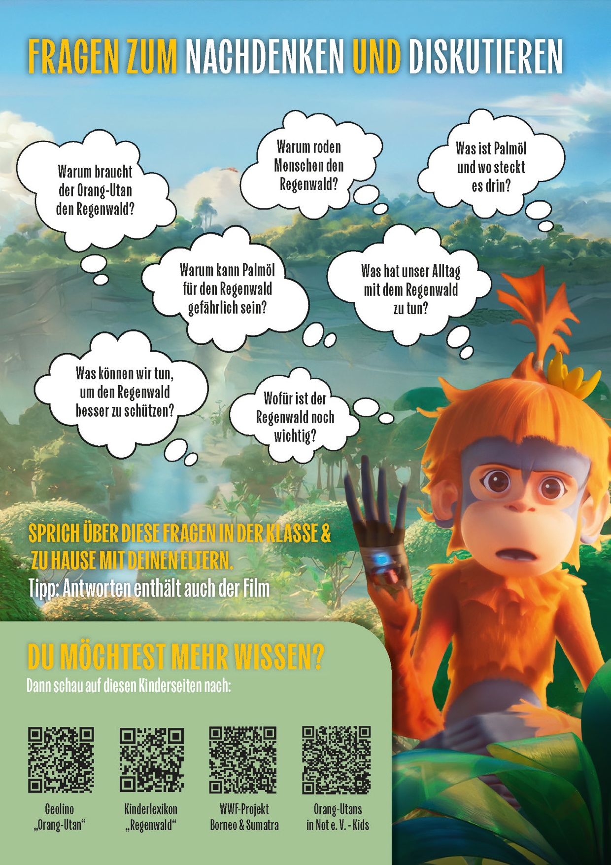 Vorstellungen für Schulklassen und Kindergruppen sind möglich. Einfach an ein Wunschkino wenden. Fächer: Sachkunde, Biologie, GeWi, NaWi, Religion, Ethik, Kunst, Deutsch, AGs (insbesondere Umwelt-AGs), Hort sowie fächerübergreifende Schulprojekte. Altersklassen: Grundschule ab 3. Klasse und weiterführende Schulen. Themen: Regenwald, Artenschutz, Palmöl-Industrie, bedrohte Tierarten, Orang-Utans, Klimawandel, Umweltschutz, Artenvielfalt, Verantwortung, Greenwashing, Social Media, Familie, Heimat, Freundschaft, Engagement und Selbstwirksamkeit.